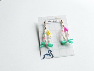 エメラルドグリーンのビーズのリボンとやさしい色合いのビーズの合わせがかわいいピアスです。