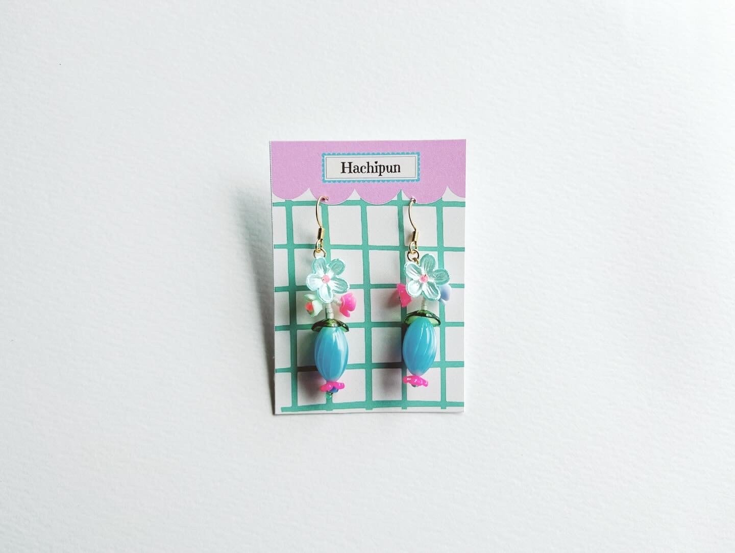 ブルーのパーツがお花の花瓶のようになっているかわいいピアスです。ブルーとピンクのコントラストも華やかです。