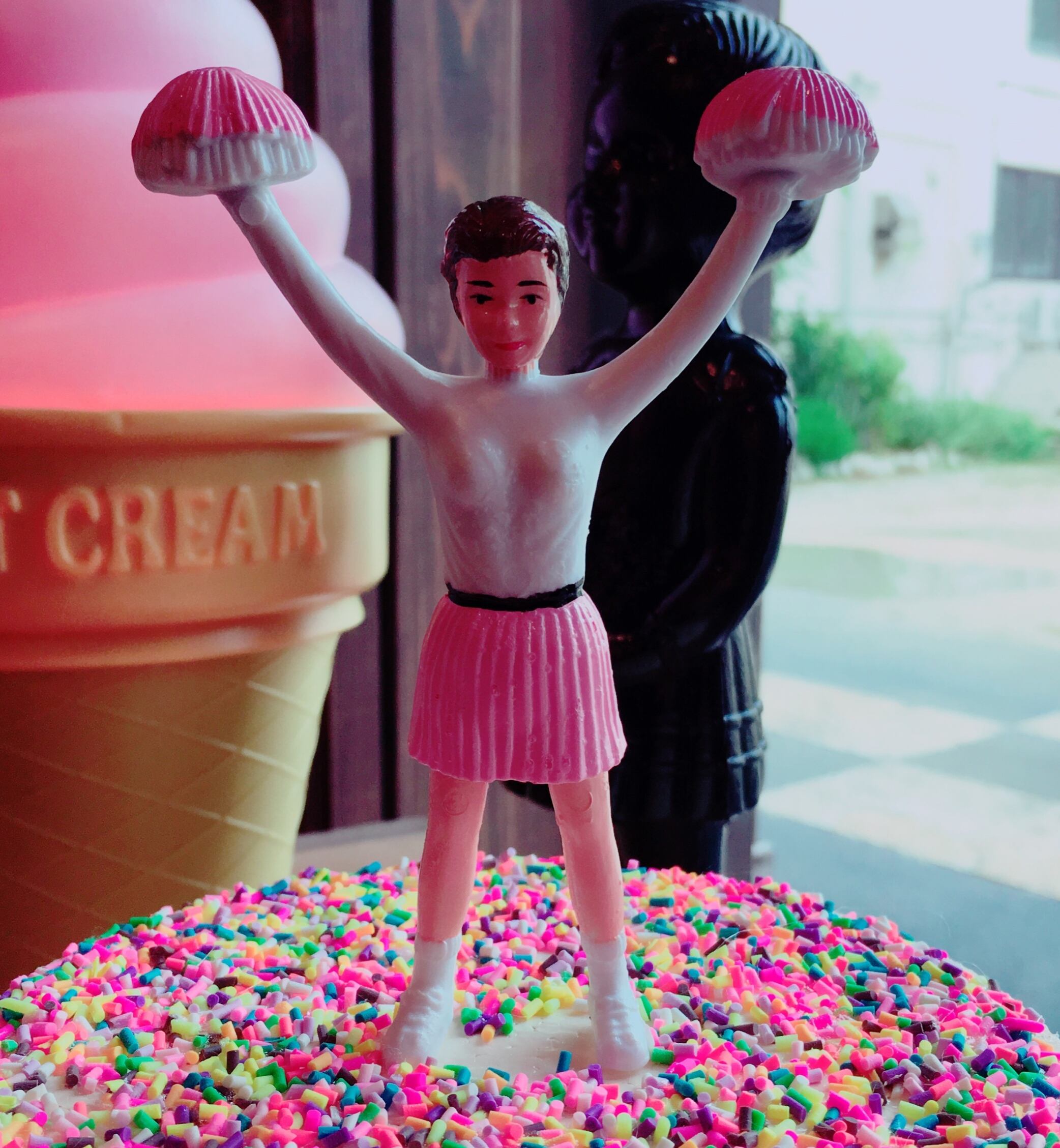 ポンポンを持ったかわいいチアガールケーキトッパー