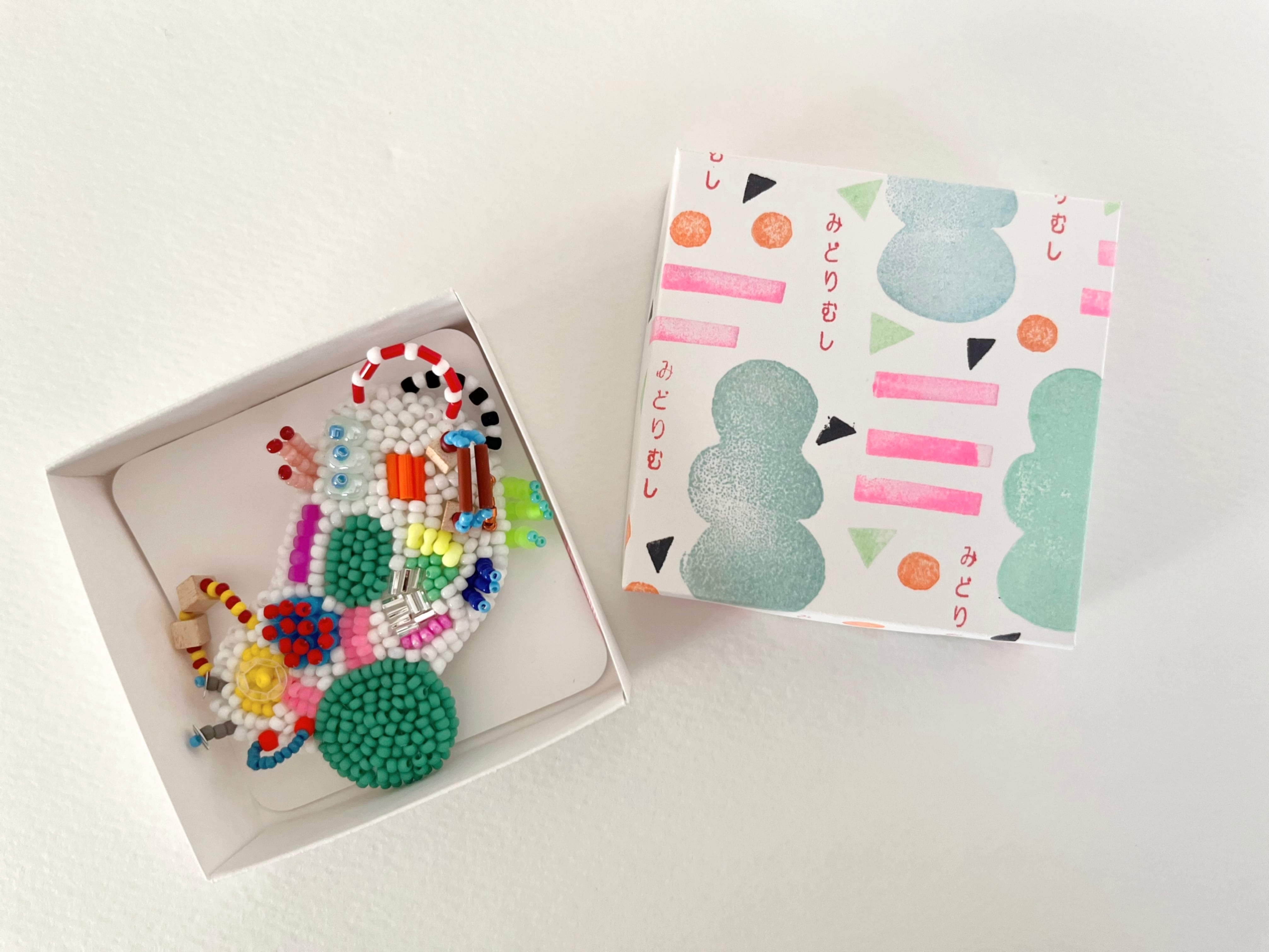 カラフルなビーズが連なるアメーバのような形や楕円形の形など、同じものは一つもない緑虫さんのアクセサリー
