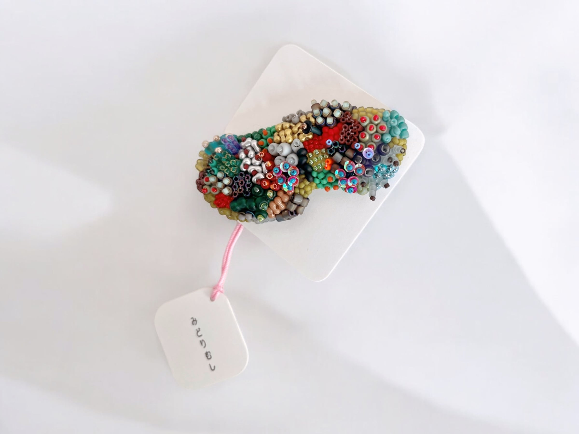 カラフルなビーズが連なるアメーバのような形や楕円形の形など、同じものは一つもない緑虫さんのアクセサリー