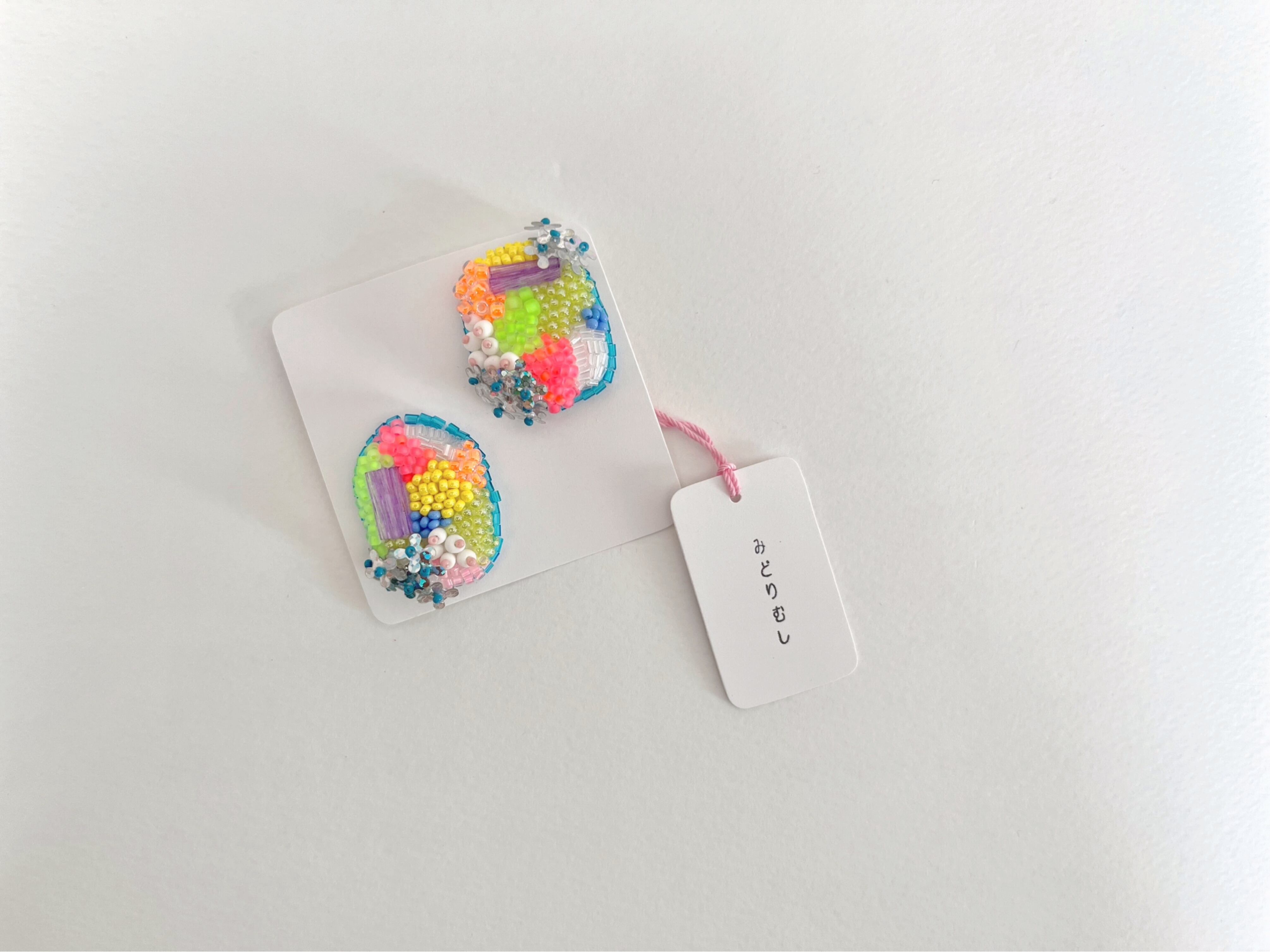 カラフルなビーズが連なるアメーバのような形や楕円形の形など、同じものは一つもない緑虫さんのアクセサリー
