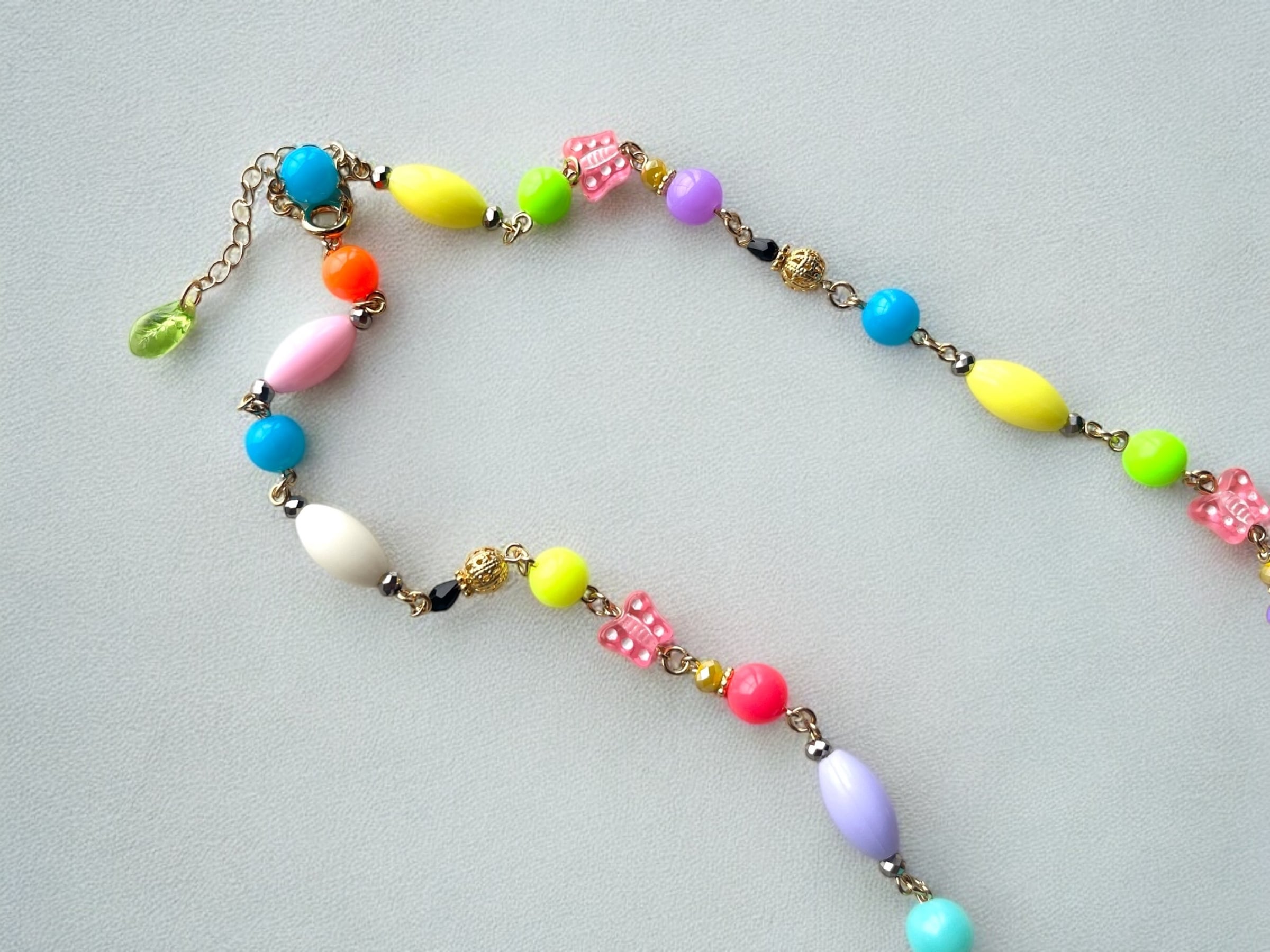 マルチカラーのカラフルなビーズとピンクのちょうちょのパーツの組み合わせのネックレス